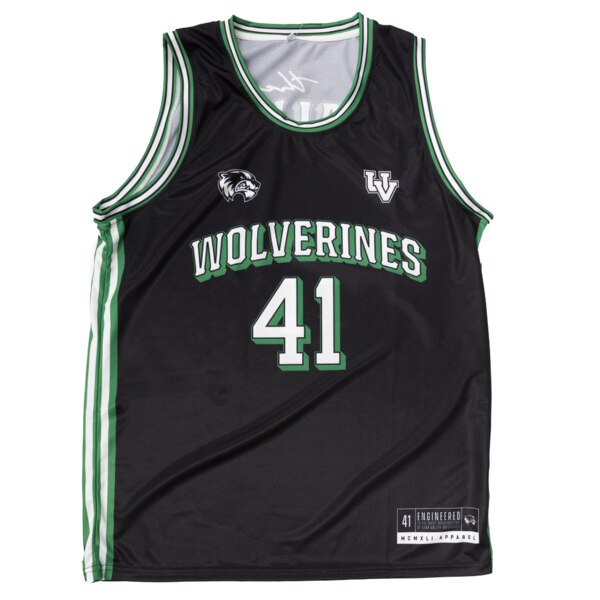 Black basketball jersey with green and white accents Wolverines and 41 on the front, The Valley and 41 on the back