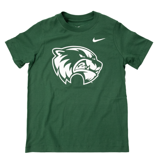 Youth, green tee with a Nike logo on the left chest and a large mascot head logo in the center