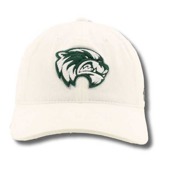 White adjustable unstructured hat with a green and white mascot logo embroidered on the front